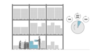 Ob bei der Fahrt oder während sich die Plattform des Kommissionierers auf und ab bewegt – der Bediener bleibt mit seinem ganzen Körper innerhalb der Fahrzeugkontur geschützt. Dafür sorgen unter anderem kompakte Lenker und große Standflächen. Wichtig sind auch verschiedene Assistenzsysteme: Beispielsweise senken die Fahrzeuge die Geschwindigkeiten in Kurven automatisch ab. Gleiches gilt bei der Fahrt mit angehobener Kabine. Die optionale Personenschutzanlage tastet den Arbeitsweg per Scanner ab und stoppt das Fahrzeug bei Hindernissen. Außerdem definieren Techniker je nach Einsatzort feste Hub- und Senkstopps im Fahrzeugsystem. Niedrige Decken oder Schwellen im Boden stellen dann keine Gefahr mehr dar.